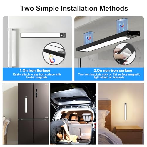 - 【Strong Magnetic, Easier to installation】 The light is magnetic and can easily be mounted to any magnetic surface or mounted on a non magnetic surface with the magnetic sticky back plates that come with the light,There are 2 U-shaped magnet symbols on the back of the light that show you where to place the adhesive metal mounts