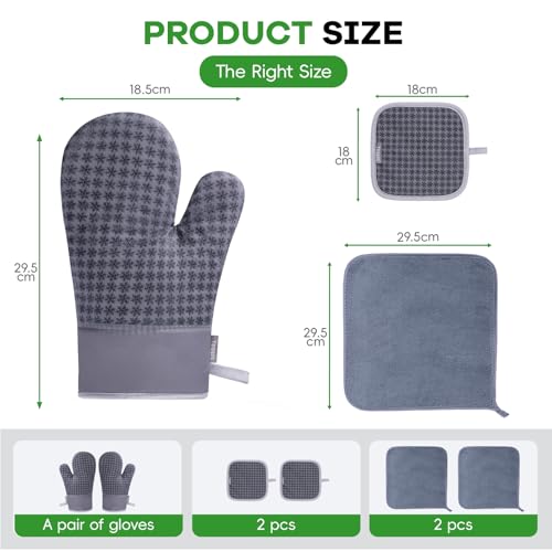 - 【6 PIECE KITCHEN ACCESSORY SETS】Our oven mitts and pot holders set including 2pcs non-slip surface silicone kitchen oven gloves (7X13in), 2pcs pot holders (7X7in) and 2 kitchen towels (12x12in), fit for indoor cooking, baking,BBQ or outdoor grilling. Also the oven mitt set is a perfect ideal kitchen gift for women, men, baker, cooker.