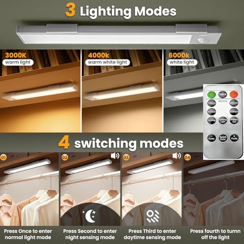 - New upgrade: 1500 mAh large battery + remote control。 【3 Lighting Modes for Wide Application】: the motion sensor under cabinet light has 3 different lighting modes including ①Always-on mode ②Night mode③, all-day mode, you can adjust the light as needed.