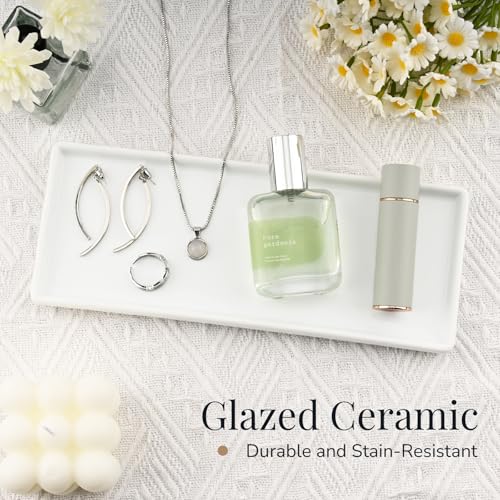 - 🧴【Aesthetic Ceramic Tray】This white tray is an artistic home decor piece, making it an excellent choice as a dressing table tray or jewellery tray dish. It’s ideal for holding small plants, aromatherapy items, cosmetics, watches, eyeglasses, rings, necklaces, bracelets, earrings, and more.