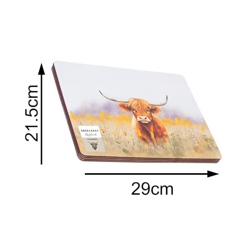 - DESIGN: This matching set of coasters and placemats features a charming highland cow print, adding a touch of elegance and warmth to any dining setup. Whether used for everyday meals or special occasions, the vibrant animal print enhances the aesthetic of your table while protecting surfaces from heat, spills, and scratches.