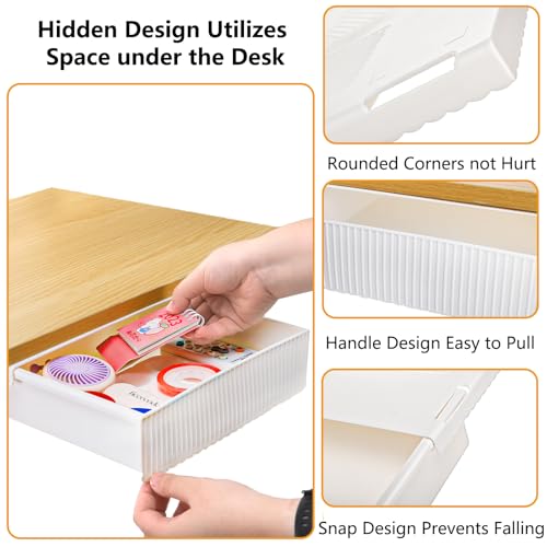- Easy to Use: The attachable desk drawers are designed with snaps on the inside of the drawer so that the drawer will not slide out when accidentally pulled out with force. The surface and edges of the under desk drawer are smooth and will not hurt your hands. It can be easily opened and closed by the small auxiliary handle.