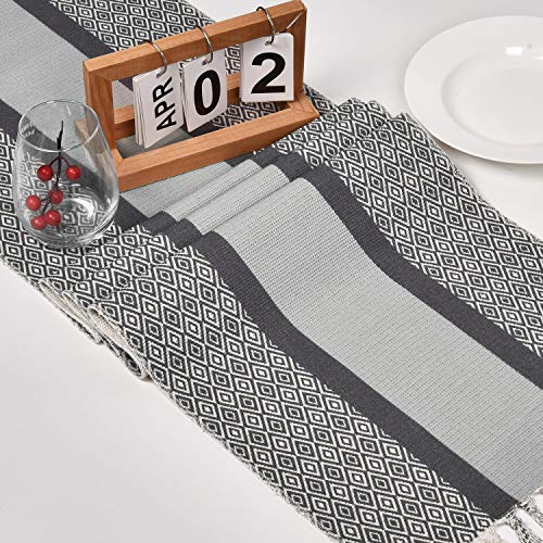 - Stylish Decor: This dark grey table runner is designed with simple but stylish striped lines and some geometric patterns. It will quickly help you to change your tables to be a new elegant and romantic look. And the table runner is a great way of safeguarding dining tables from dripping candle wax, saucy spills, and occasional scratches.