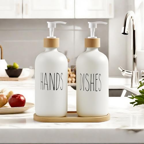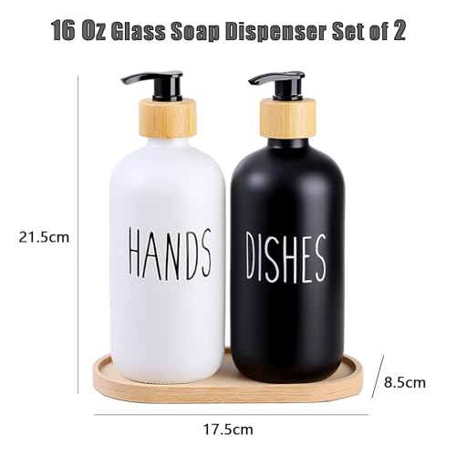 - Stylish & Functional Set of 2: Two elegant 16oz (480ml) glass dispensers with smooth-action pumps, perfect for organising hand soap and washing-up liquid separately. Includes coordinating bamboo pump heads and a durable bamboo tray