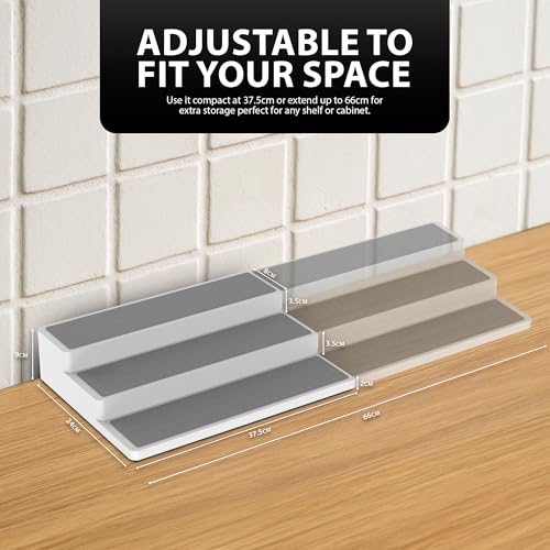 - NON-SLIP SURFACE FOR STABILITY – Designed with a textured non-slip coating, this kitchen cupboard organiser prevents jars from sliding, ensuring secure storage for spices, bottles, and containers.