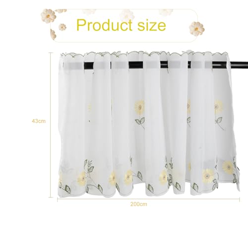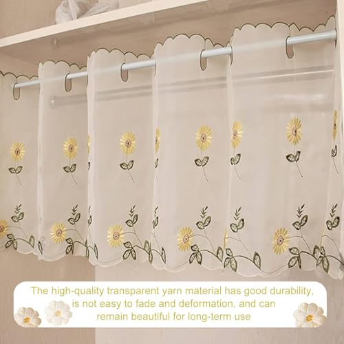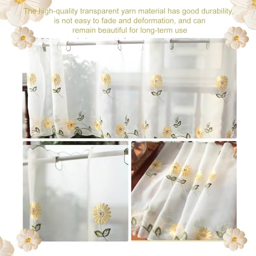 - 【Delicate Sunflower Embroidery Design】: Adorned with exquisite sunflower embroidery, these small valance sheer curtains deliver a charming, lively vibe to any space. The design ensures partial sunlight filtering while maintaining privacy.