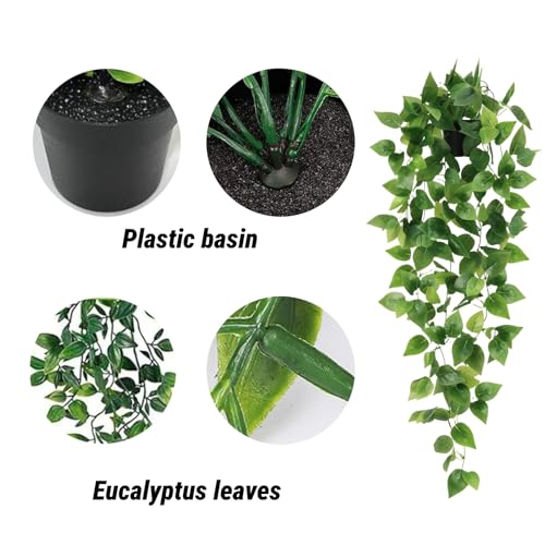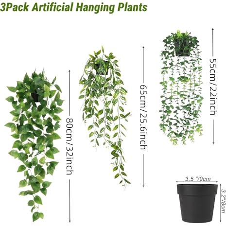 - 3Pcs Hanging Artificial Plants with pot: There are 3 pots of artificial hanging plants, length approx 22" for eucalyptus leaves, 25.6" for pea pod leaves, and 32" for mandala leaves. The black plastic pot size is 3 "x 2.6" .